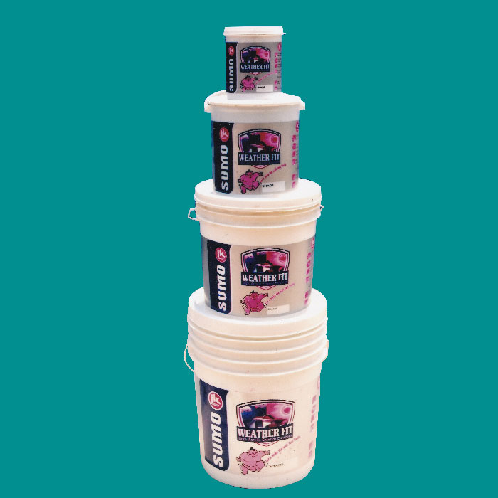 SUPERIOR QUALITY OF SUMO WEATHER FIT ACRYLIC EXTERIOR EMULSION IN SMOOTH SEMI-PASTE FORM IS WATER BASED, ACRYLIC BASED, ANTI-ALGAE & AN EXCELLENT PERFORMER FOR EXTERIOR WALL FINISH. IT CAN BE APPLIED ON ALL TYPE OF CEMENT PLASTERS, BRICK WALLS, CEMENT CONCRETE, ASBESTOS SHEETS. ALSO APPLICABLE TO INTERIOR WALLS FOR EXCELLENT ACRYLIC SMOOTH FINISH.